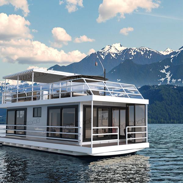 The boat is constructed from durable aluminum material, ensuring a sturdy and reliable structure that can withstand the elements. This aluminum house boat is not only functional but also stylish, with a sleek design that enhances the overall aesthetic appeal of the floating hotel.